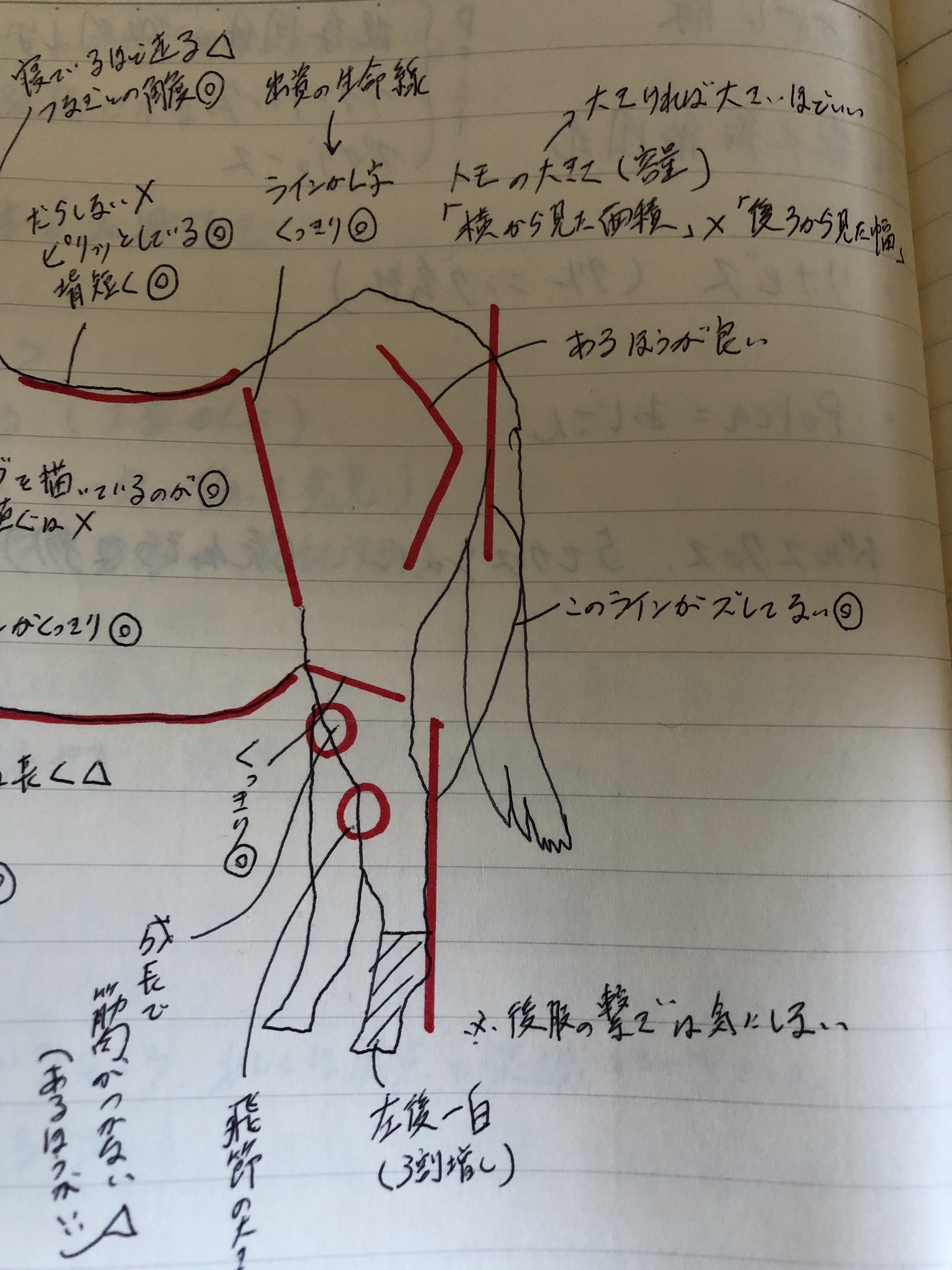 「上半身」と「下半身」に分けて後ほど詳しく解説しますが、全体像で重要なポイントは赤ペンで書いてある部分とバランスです。
